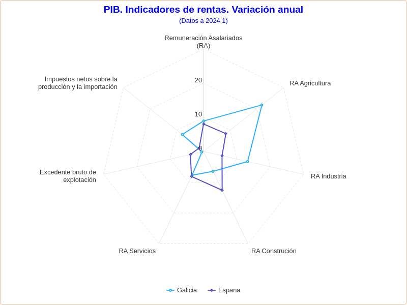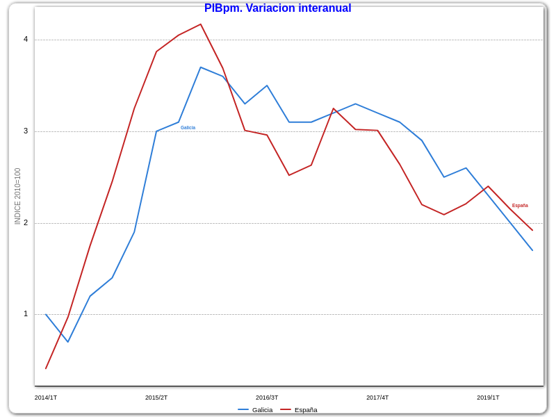 El valor añadido bruto de las ramas industriales se incrementa un 3% interanual (dos décimas más). Dentro de las mismas, la industria manufacturera presenta una tasa del 3,5% (seis décimas superior a la del trimestre precedente). La construcción crece un 6,6% (seis décimas más). La variación interanual del valor añadido bruto de los servicios es del 2,1%, cuatro décimas menos que la del trimestre precedente. Las ramas primarias suben el 5,6% este trimestre, frente al 3,3% del anterior.