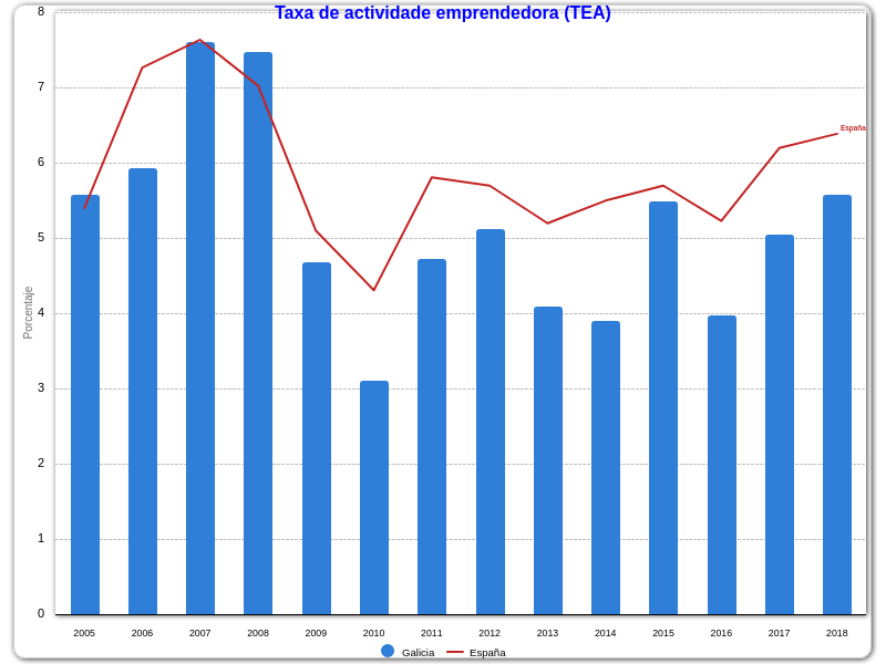 Tras a suba da taxa no ano 2015, no 2016 Galicia regresa a valores similares aos dos anos 2013 e 2014, cunha evolución parecida á rexistrada no estado español. Compre recordar que a taxa de actividade emprendedora é un indicador composto e que, por tanto, a súa interpretación é complexa.